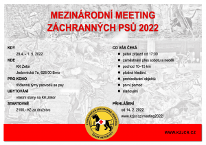 Kynologická záchranná jednotka České republiky si Vás dovoluje pozvat na Mezinárodní meeting záchranných psů 2022, který proběhne 29. 4. – 1. 5. 2020. Soutěž je určena pro tříčlenná družstva psovodů se psy a je zaměřena na praktickou práci záchranných psů.