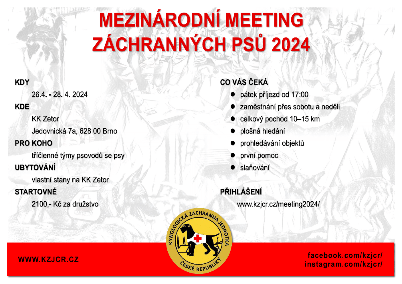 Kynologická záchranná jednotka České republiky si Vás dovoluje pozvat na Mezinárodní meeting záchranných psů 2024, který proběhne 26. – 28.4.2024. Soutěž je určena pro tříčlenná družstva psovodů se psy a je zaměřena na praktickou práci záchranných psů.