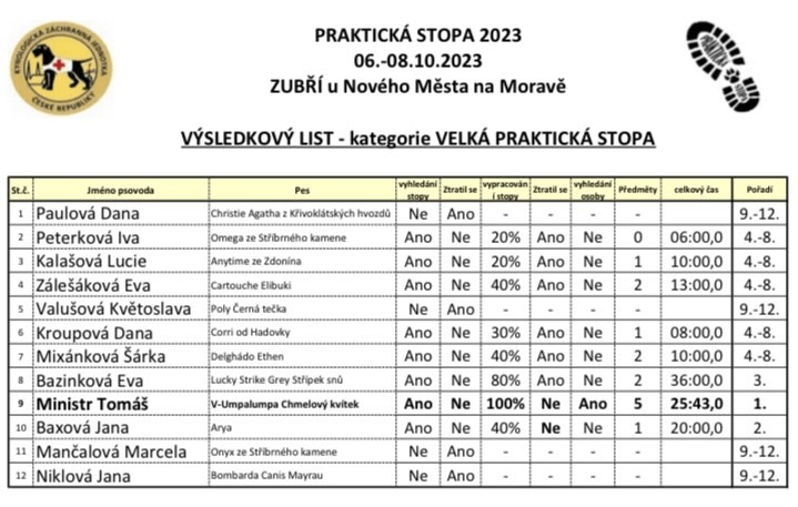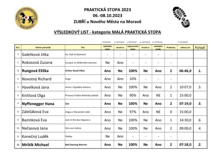 Za KZJ nastupovala do Velké praktické stopy Dana Kroupová s Corria umístila se na 4.-8.místě, do Malé praktické stopy Hana Nyffenegger s Zoe a obsadily skvělé 3 místo. Taktéž Jana Havelková s Arnie malou praktickou stopu úspěšně zvládly a obsadily 5.místo, přičemž o pořadí rozhodoval čas vypracování stopy.